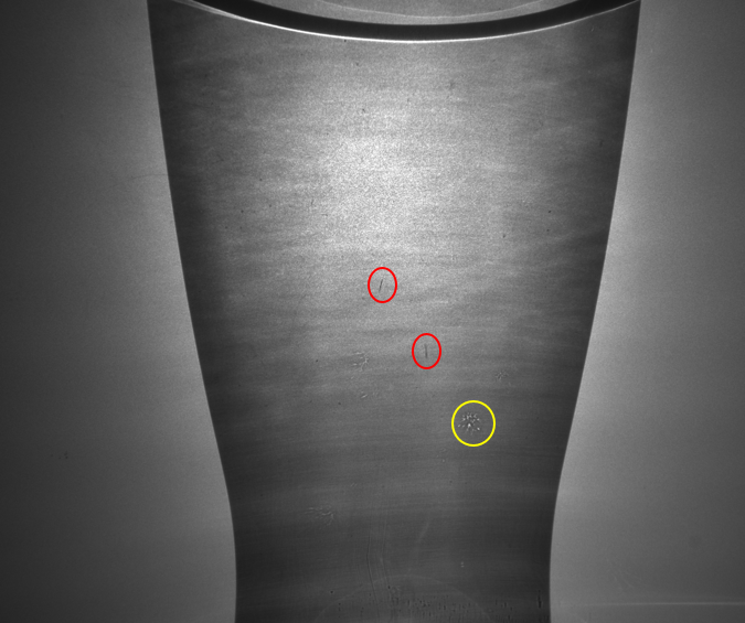 また、目視では発見することが出来なかった脈理などの成型傷も可視化する事が可能となった。(黄色丸が成型傷)